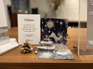 真っ赤なベルと一緒に、寒い中ご来店してくださるお客様をほっこり温めてくれるようなクリスマスのアレンジに。