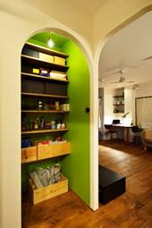 パントリー収納には、思い切って扉を付けずに、内部を清潔感のある『グリーン』に。