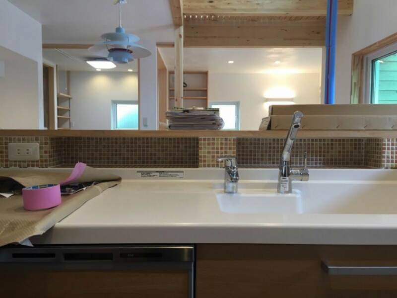 キッチンには、名古屋モザイク コスミオン オレンジ色タイルと、ルイスポールセン 水色の PH-50 で愉しいファミリーインテリアに。↓