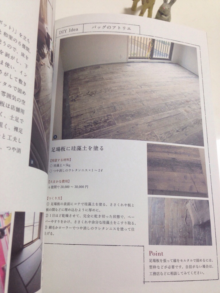 珪藻土を足場板に塗るとアンティック調になり、とても味わいとオリジナルな床が出来ます☆