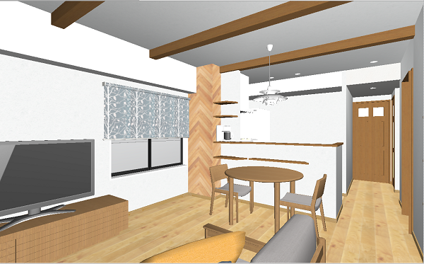 リビングにはアクセントのヘリンボーンを貼っているところ。1枚1枚手作業でカットして貼り合わせていきます。