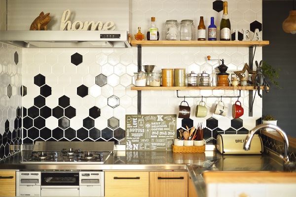 キッチンはウッドワンの木製キッチンに、六角タイルを合わせました。