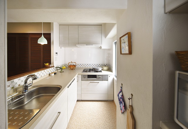 中のL型キッチンは広々としたスペースで、お料理上手の奥様のお気に入りのスペース。