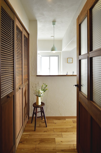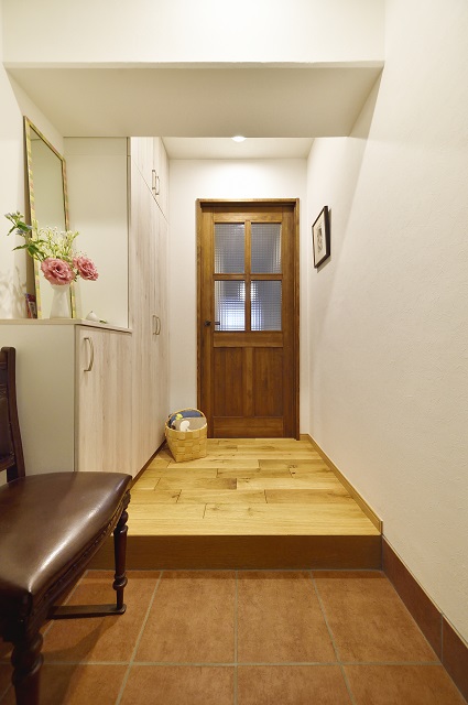 玄関からのアプローチ、テラコッタ調のタイルやヴィンテージ調の白い収納が印象的な明るい雰囲気に。