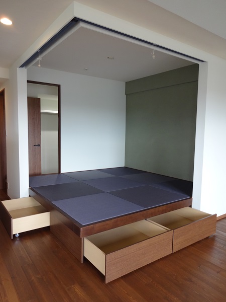 畳下はすべて収納になっています。奥にはご家族の洋服を収納できるウォークインクローゼットもつくりました。
