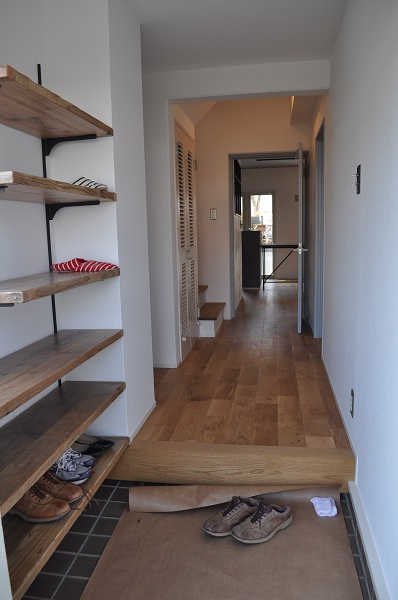 玄関は足場板を使ったオープンシェルフを作りました。