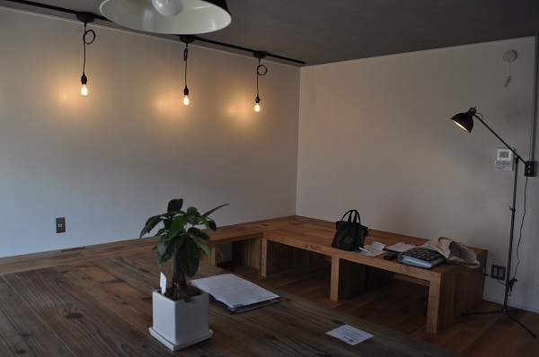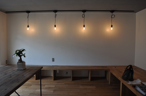 ご主人こだわりの寝そべれる小上がりとTV台もフローリングと同じ材で仕上げて造作しています。