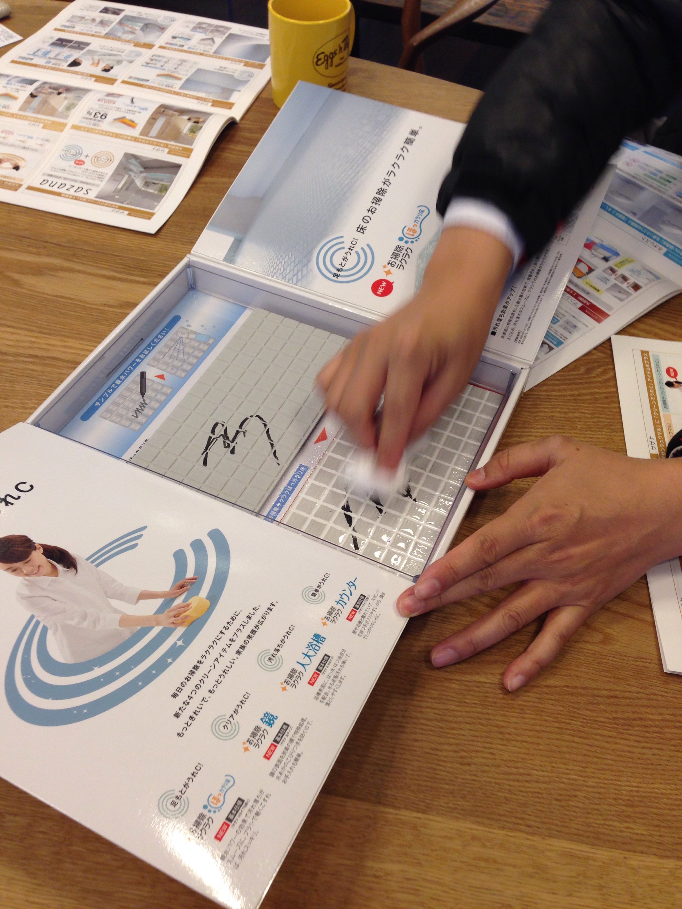 どれだけ汚れが落ちやすいのか、実験キットで試してみると… (ちなみに、上が従来の床、下が新しい床です)