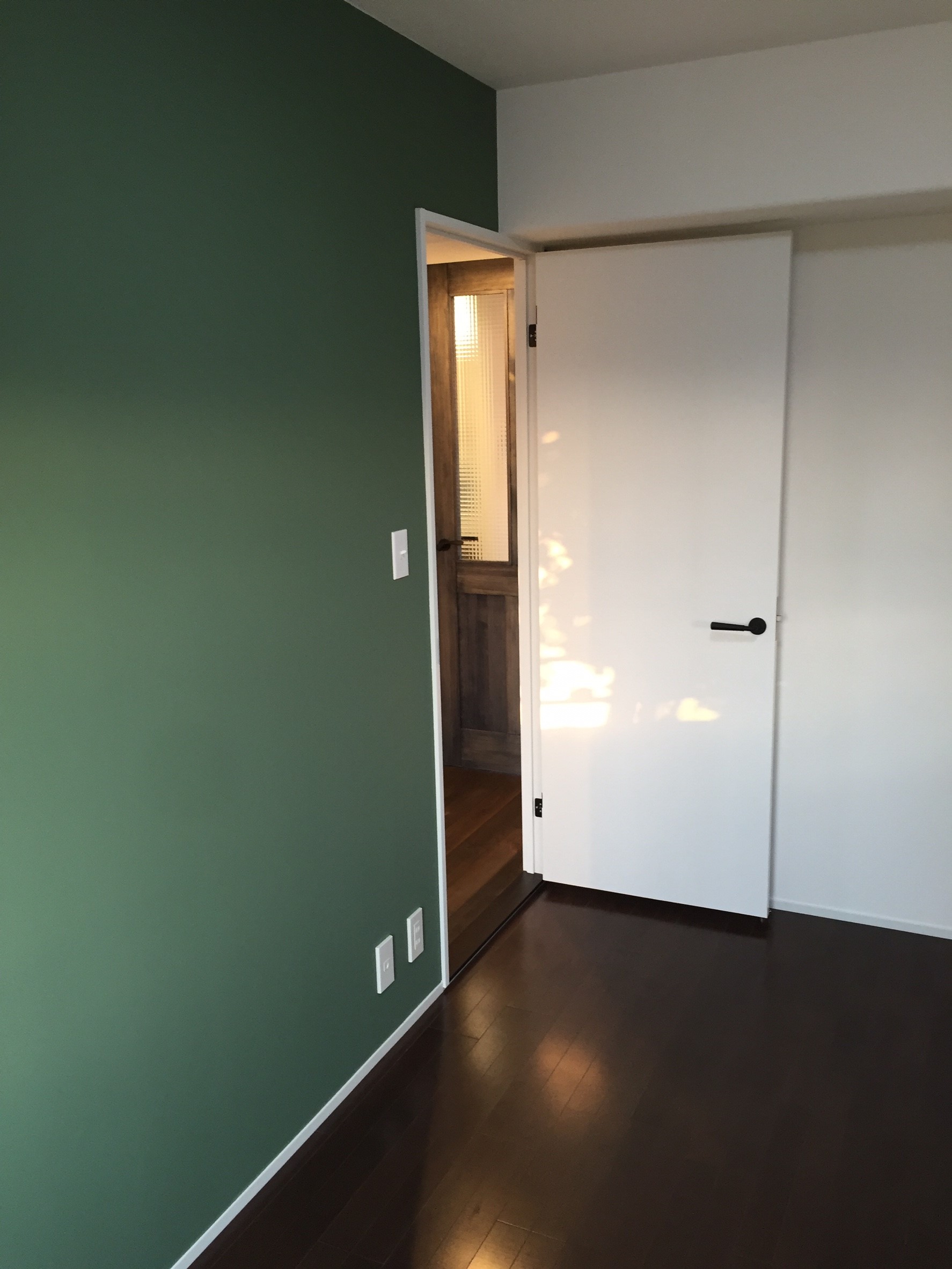 個室は、それぞれ、グリーンとパープルで、一面だけ壁塗装しました。