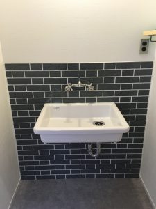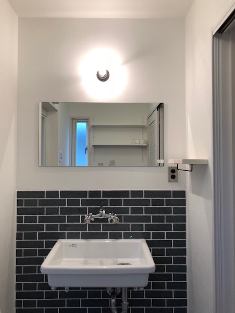 TOTO/SK7 の実験用シンクを設置しました。 タイルをダークなカラーでまとめると、 大きなシンクで機能性もあり、 シックな印象のオリジナルの洗面スペースになりました。