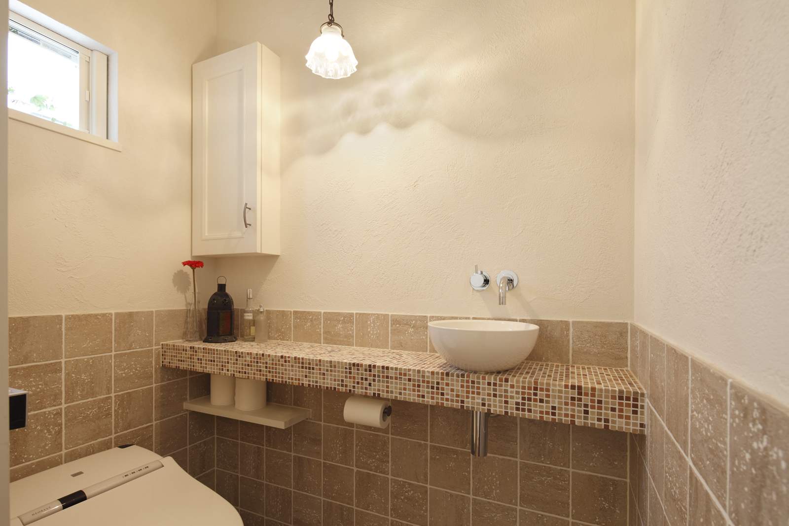 モザイクタイルで造作した、シンプルなトイレカウンター ぽっこり丸い手洗い器とホワイトの収納棚、ペーパーストック棚。 小さなスペースこそ、シンプルでオリジナルな空間へ。