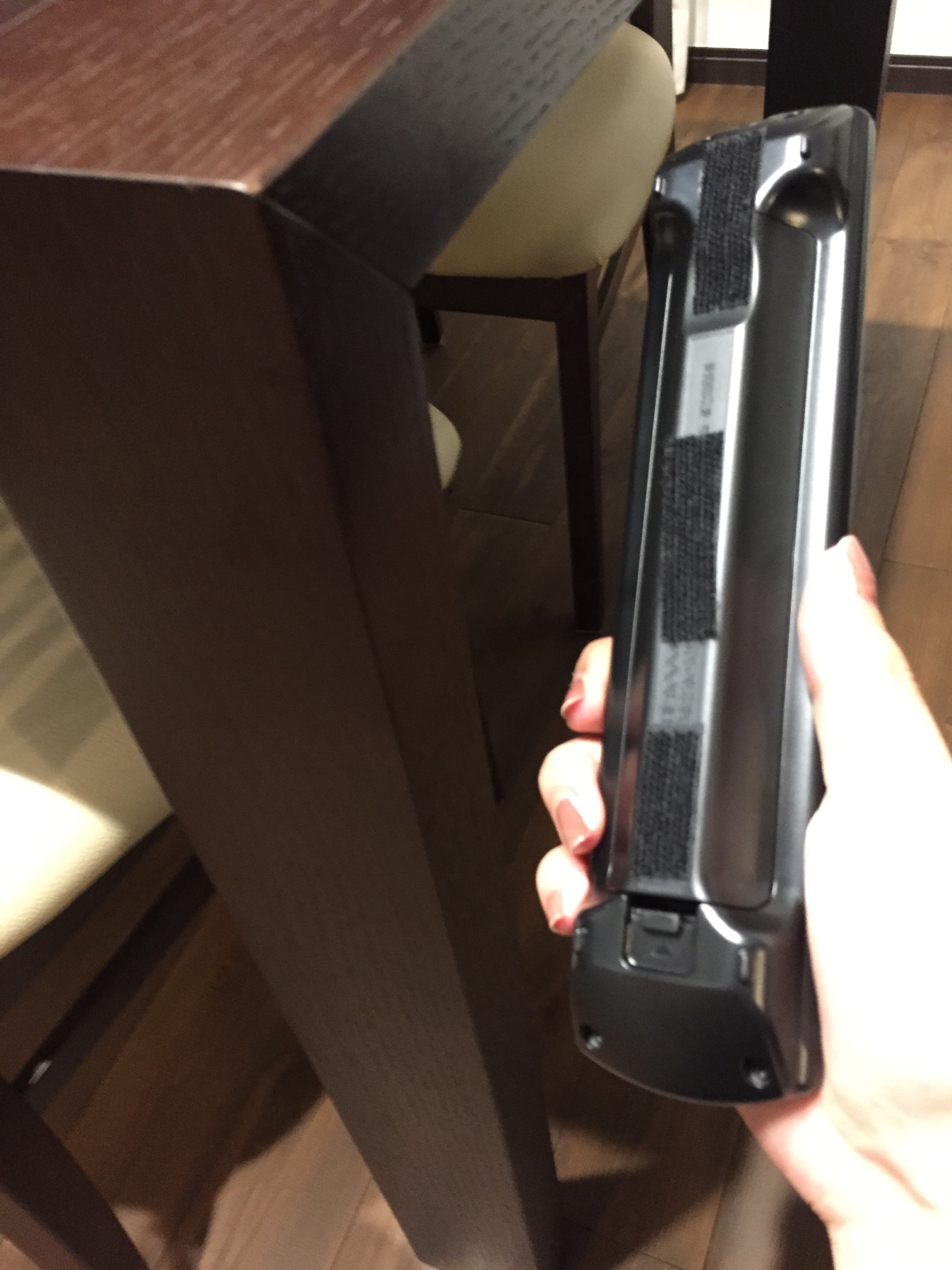 机とリモコンの裏にマジックテープで付いてました!