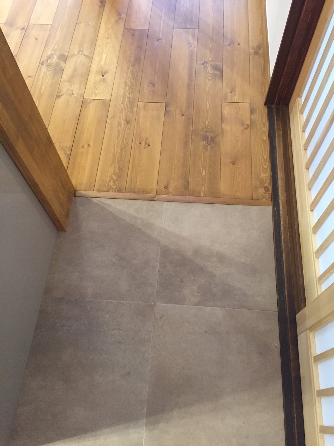 玄関ドアに見えるのはおそらく床が石に見えるフロアタイルのためだと思いますが・・・