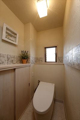 ライン状に貼りつけた大きめのタイルで空間にアクセント。エレガントな仕上がりになっています。