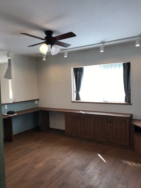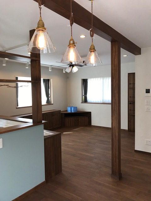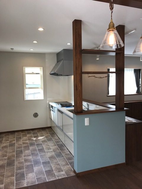 ブルーグレーの腰壁とミディアムブラウンの家具、柱、梁 ステキな色合いの戸建リフォーム完成しました!