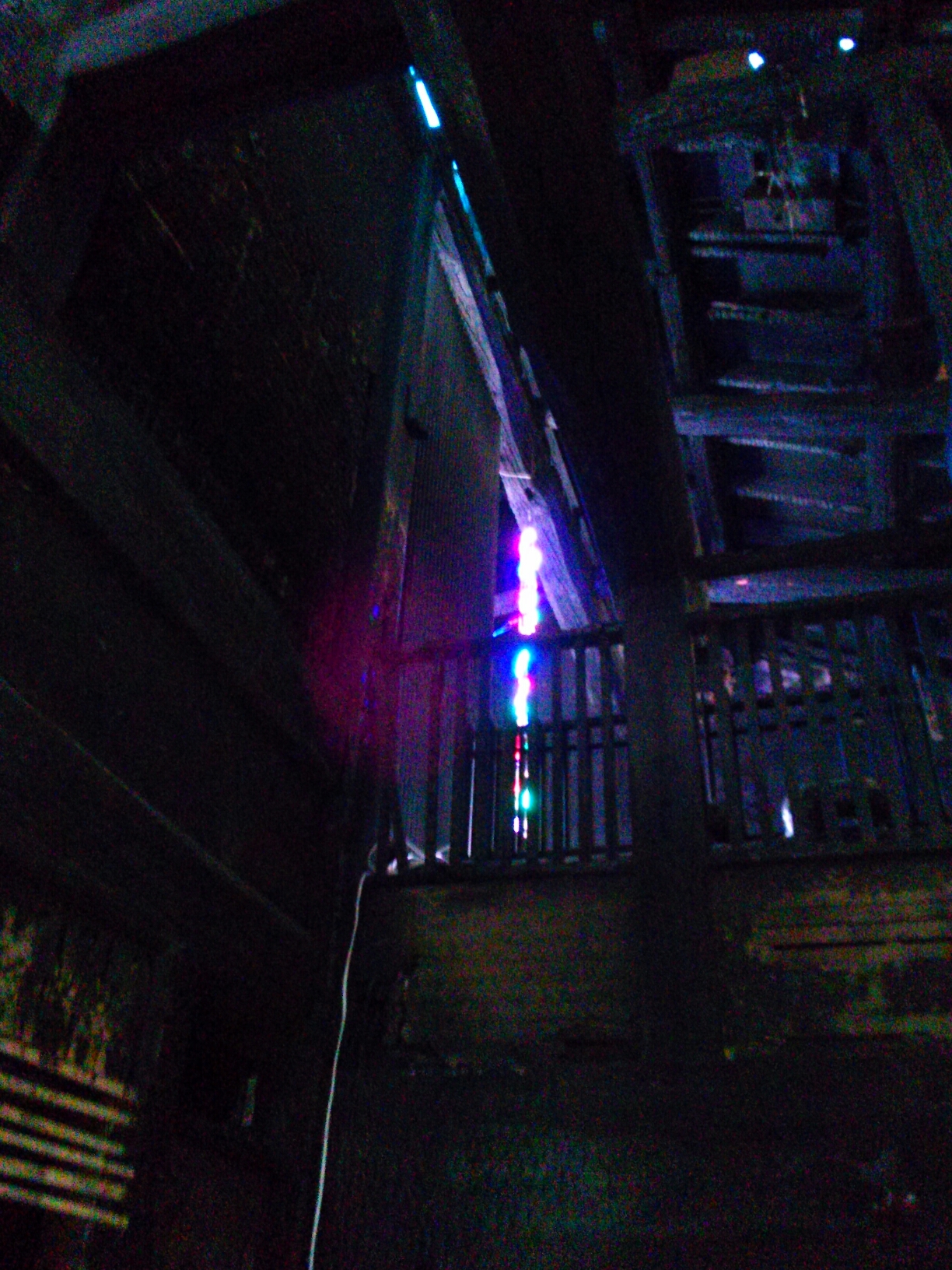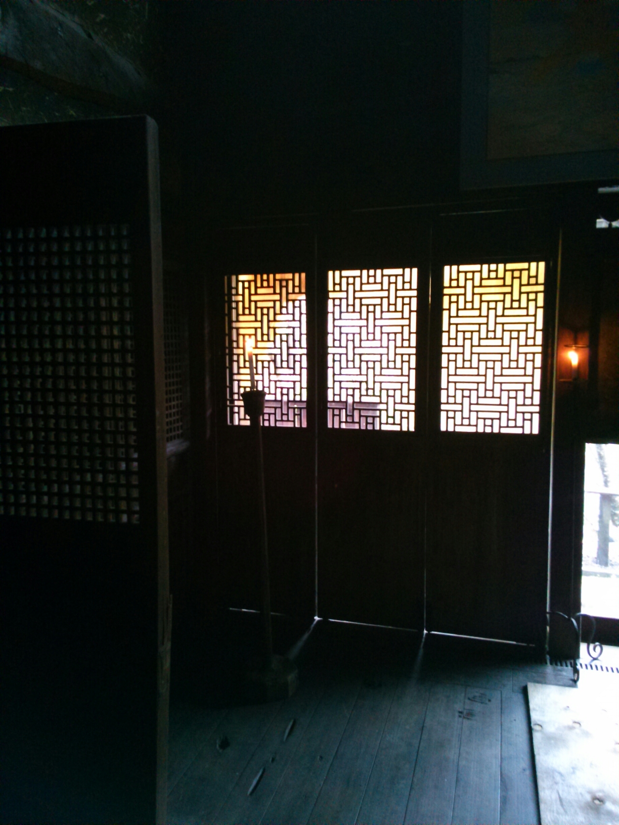 ろうそく、巻ストーブ、格子戸や天井近くの窓から入ってくる日差しが不思議な雰囲気を作り出します。