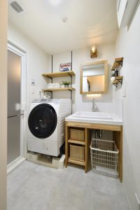 造作で、ホワイトのタイルを使いたいとのご希望を叶えた洗面化粧台です。