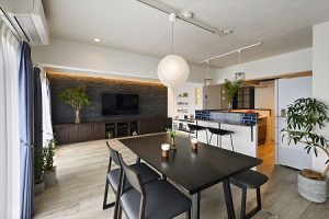 TV背面のアクセントタイル&間接照明。