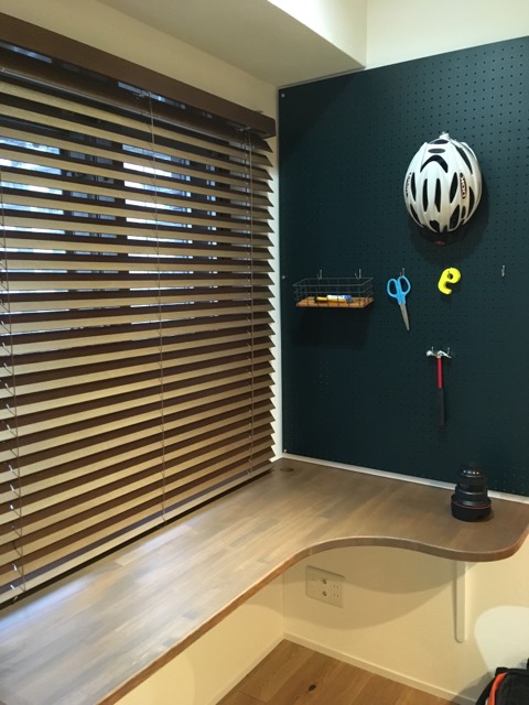 旦那様のデスク横にもヘルメットや文房具などが飾られて、