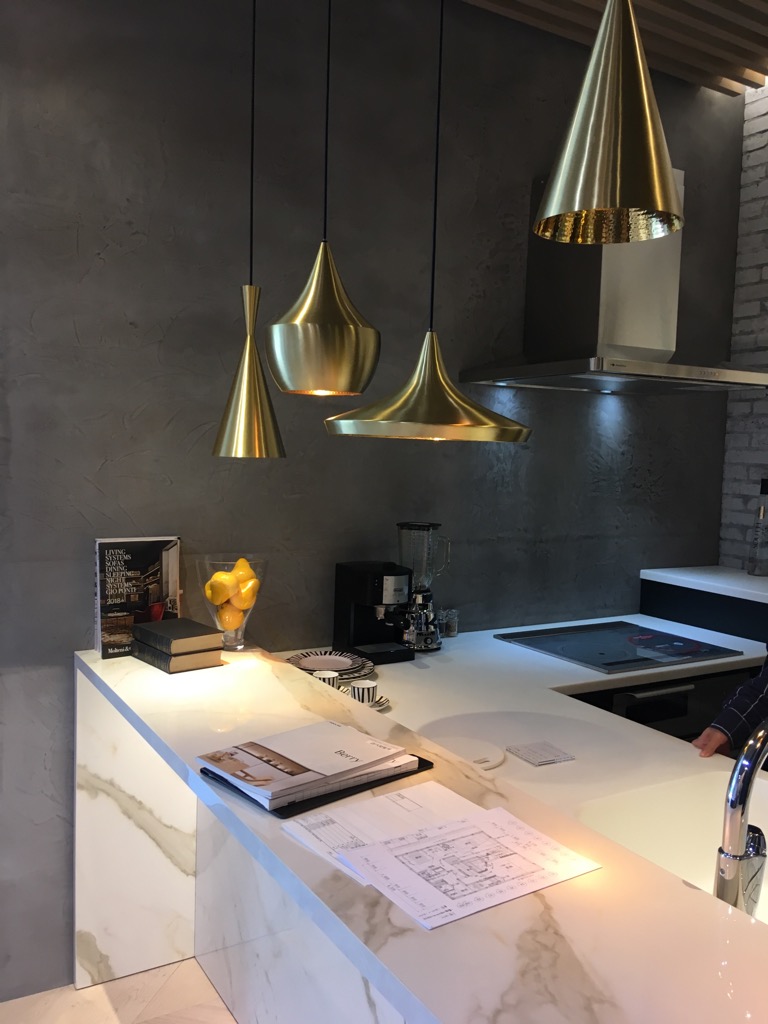 石のカウンターとTom Dixonの照明がとても素敵です!