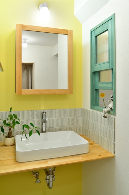 湿気がこもる隣の脱衣室との壁には、オリジナルのインテリアウィンドウを取り付け、空気が流れるようにプランしました。