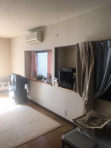 造り付けの収納を取りはずし、反対側の和室の床の間までをリビングに取り込み、ワークスペースにしました。