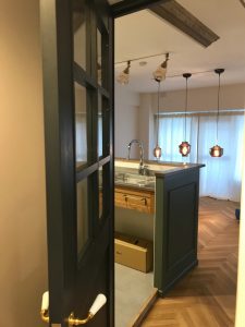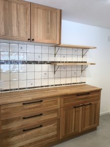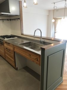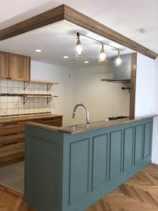 キッチンとカップボードは、無垢の木の扉を使ったウッドワン。