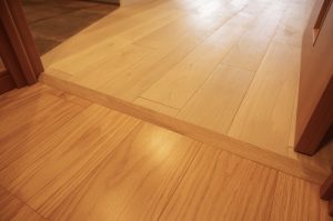 ちょうど閉めた時ドアの下にあたる部分で、斜めに見切材を入れています。