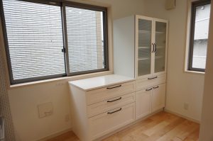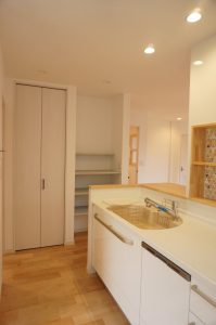 キッチンは、「奥行のあるカップボードを3台置きたい」というご要望を叶えつつ、パントリー収納もたっぷり取りました。