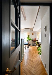 デザインは、ヘリンボーン貼りのフローリングやモールディングを回してクラシックですが