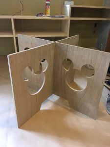 現場では、車で持ち運びしやすいように、このようなベニヤ板を組んだ脚に板を乗せて、即席作業台を作り作業をされています。