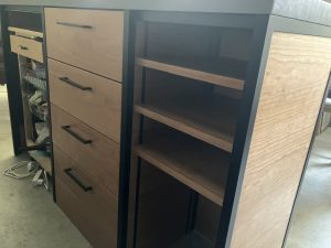 お手持ちのワゴンもピッタリ納まり、引き出しと可動棚のスペースも設けました。