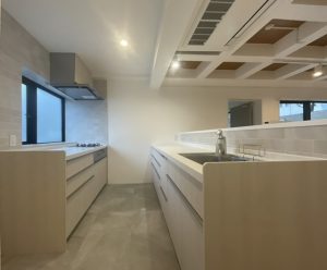 建具の塗装色やキッチンタイルとの相性もよく、既存の天井の良さがより一層