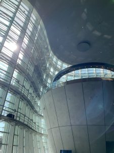 天気の良い陽だったので、大きな吹き抜け空間に、くねくねしたガラス面からたくさん陽が