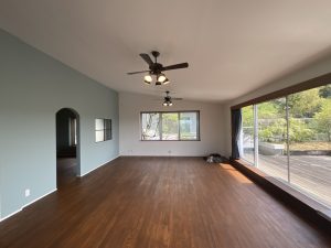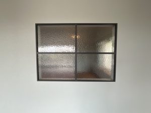 ブルーをアクセントに、アイアンの室内窓や高い天井を活かした