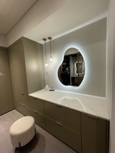 造作のドレッサーもマットな面材×大理石調