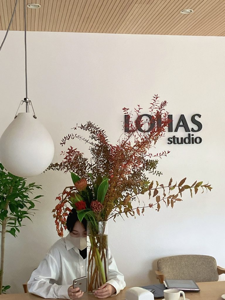 ▲お花を抱えてお仕事中の小泉SC 左の大きなペンダントはルイスポールセン