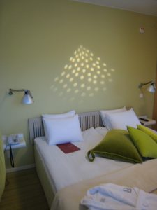 こちらはスウェーデンのデザインホテルのスイートルーム。泊まることは出来なかったので見学させて頂きました(^^)グリーンの壁に森林の照明が浮かび上がります。