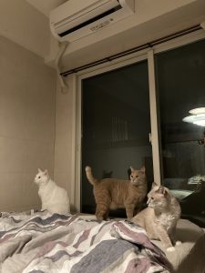 ⑪あまりの暑さに寝室にもエアコン設置・・なんだなんだと集まるニャンズ