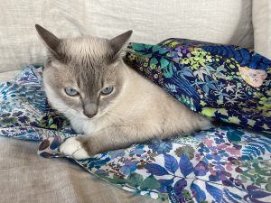 私のスカート用のリバティ生地にくるまるノア姫(^^)