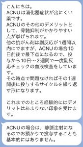 抗がん剤は2種類あり、1週間に1回の投与を25週間続けるものと、3週間に1回を8回(24週間)続けるもの。1週間に1回の方は3回に1回は半日入院。