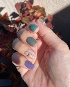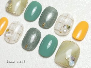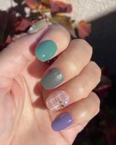こちらはシックなグリーンとパープルを合わせた大人カラーのネイルチップ☆小指はイエローもお願いし服に合わせて付け替えらるようにしました(^^)