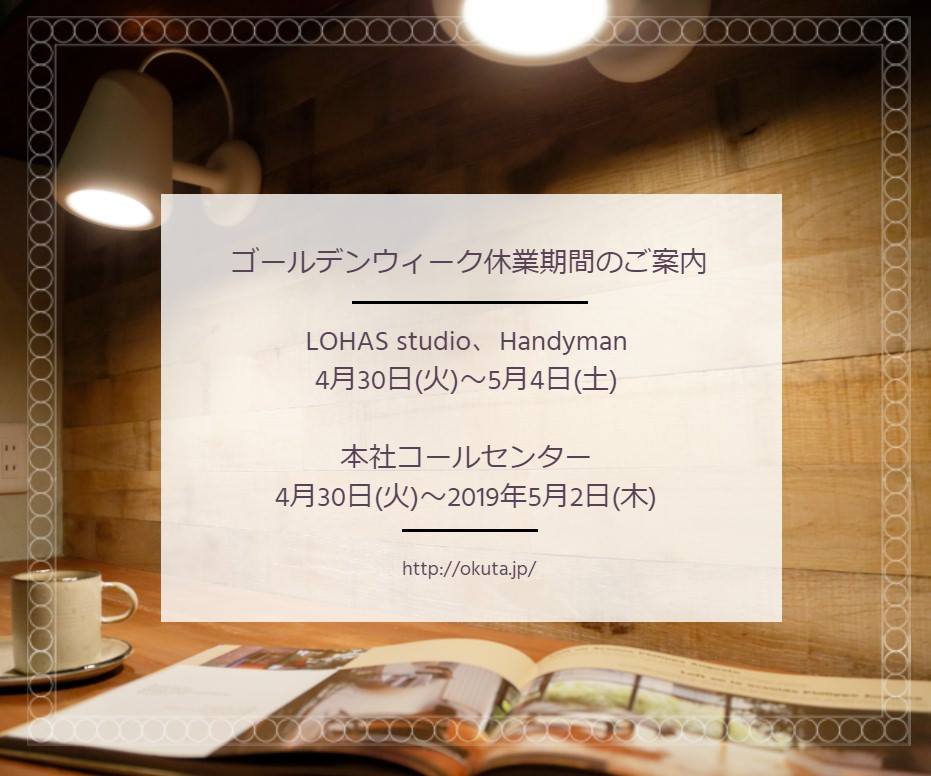 日頃よりご利用いただきまして誠にありがとうございます。 LOHASstudioとHandymanは、 ゴールデンウィーク休業の期間を下記の通りとさせていただきます。 ・ お客様にはご迷惑をおかけいたしますが、 何卒ご了...