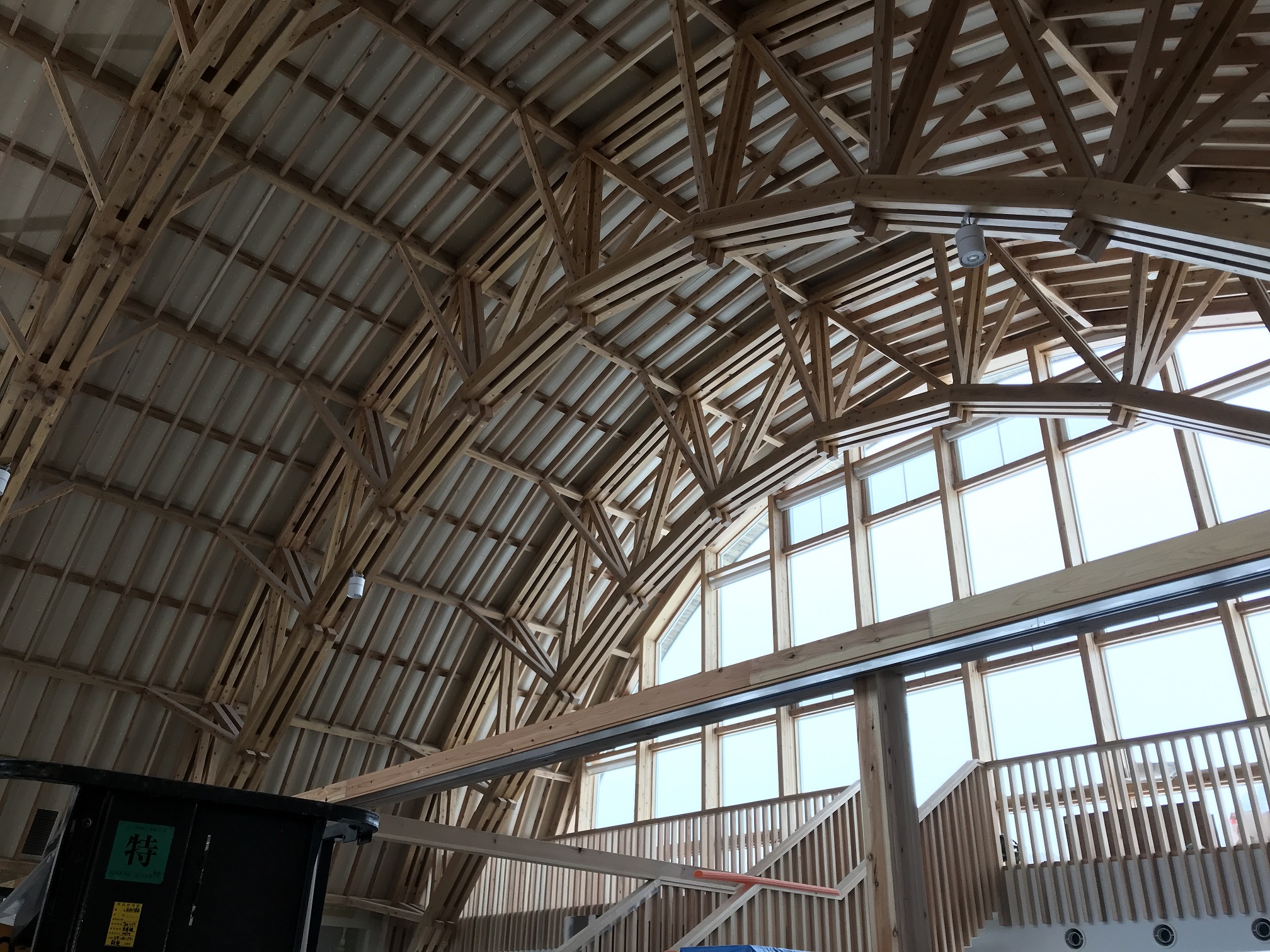 アーチ構造が印象深いのですが、アーチの部材は規格サイズの組み合わせで、