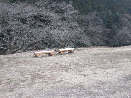 里山保全活動で作った丸太のベンチが心地良いこと請け合います。