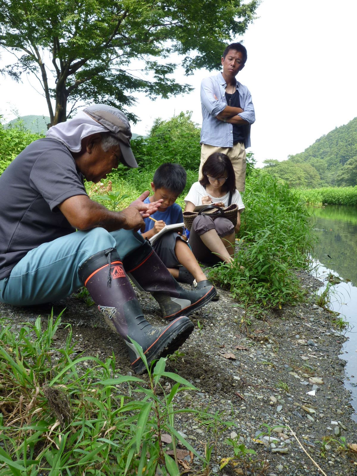 <合鴨にエサをやるこうじ君> <河原で質問攻めのこうじ君とご両親と講師の安藤武さん>