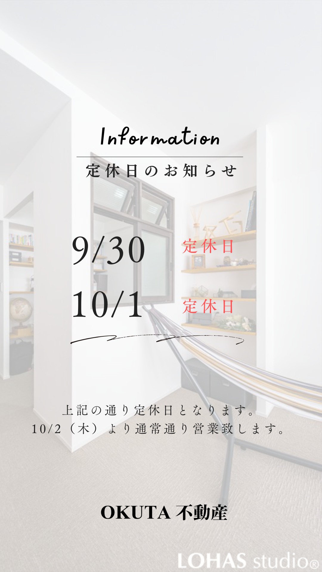 \こんにちは!OKUTA不動産です/ 定休日のお知らせです。 今週に限り、9/30(火)・10/1(水)が定休日となります。 10/2(木)より通常通り営業致します。 ご迷惑おかけいたしますが何卒よろしくお願い致します。 &n...