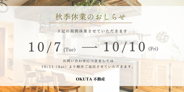 \こんにちは!OKUTA不動産です/ 秋季休業のお知らせです。 10/7(火)~10/10(金) 誠に勝手ながら上記の期間中 秋季休業をいただきます。 10/11(土)より通常通り営業致します。 ご迷惑をおかけし大変恐縮です...