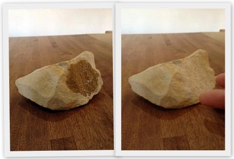 (左)珪藻土の原石に水を吹きかけた瞬間