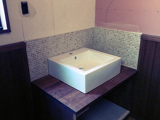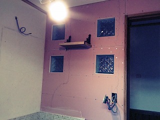 洗面スペースとトイレの間の壁にはガラスブロック。